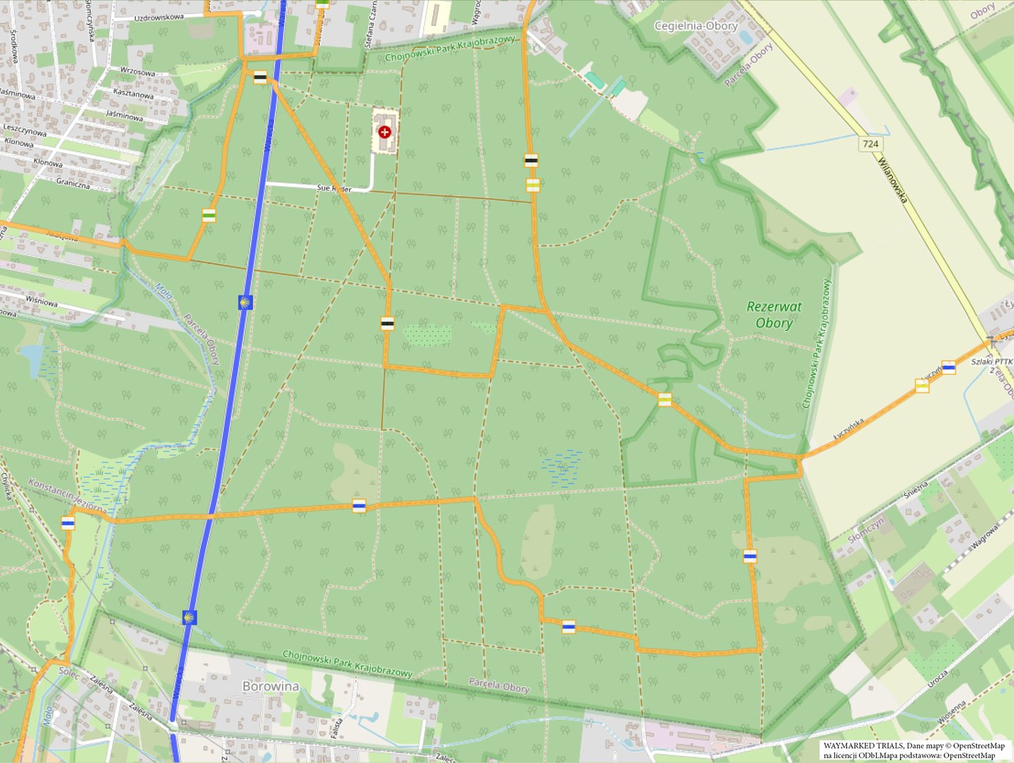 Najłatwiej dostępna z Warszawy trasa jest jednocześnie najdłuższą. Prowadzi lasami Chojnowskiego Parku Krajobrazowego pomiędzy siedzibą Nadleśnictwa Chojnów w Pilawie a południowym skrajem Konstancina-Jeziornej. O atrakcyjności krajobrazowej i przyrodniczej tych lasów świadczy duża ilość przecinające je szlaków PTTK. Pętla wykorzystuje kolejno: czarny Chojnowski Szlak Zabytków Przyrody, zielony Główny Szlak Lasów Chojnowskich, czarny Szlak Zabytków Architektury, żółty Szlak Nadwiślański oraz niebieski Szlak Rezerwatów Przyrody.