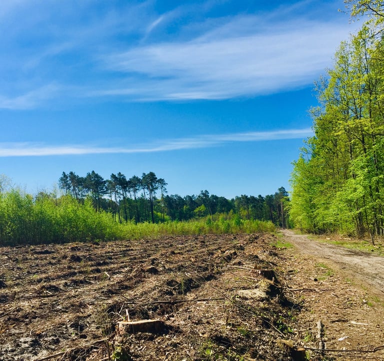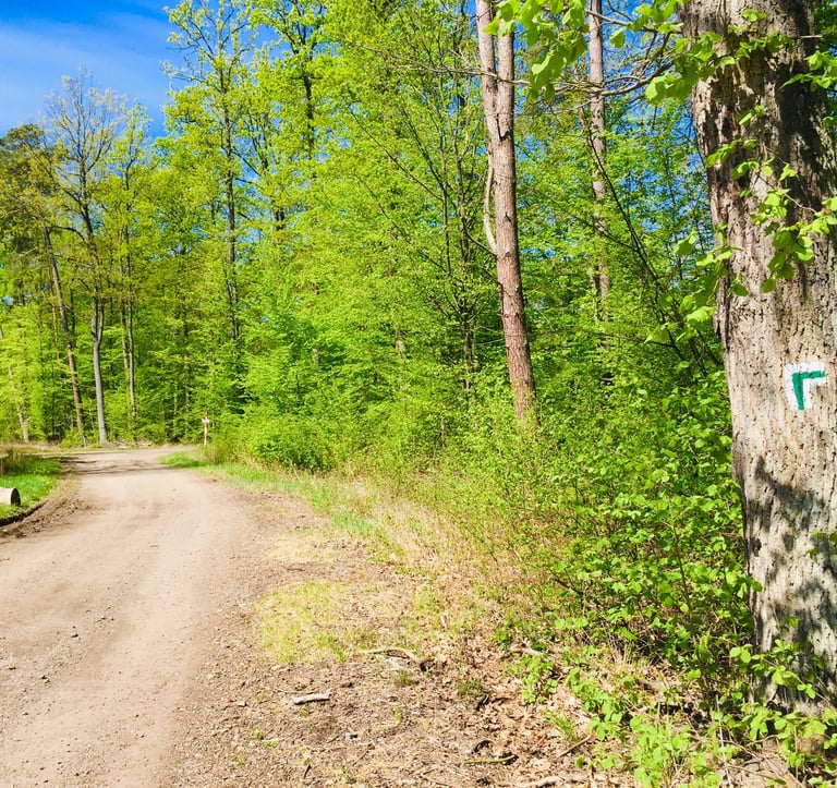 Droga skręca na południe, przed wielkim zrębem szlak czerwony odbija na wschód, dalej trasa przez pewien czas pozbawiona jest oznakowania. Na zrębie, wiek rosnących jeszcze niedawno drzew ocenić da się po potężnych pniach, na których przysiąść można, robiąc przerwę w marszu. Takie 150 letnie drzewostany liściaste są chronione jedynie na powierzchni 15 ha rezerwatu leśnego “Las Pęcherski”. Trasa skręca tu w lewo na wschód za znakami ścieżki edukacyjnej “Gonna Sosna”. Jej odcinek przecina rezerwat, porośnięty głównie dębem i sosną, a także grabem z brzozami i leszczyną w podszycie. Różnorodności gatunków dopełnia bogate runo.